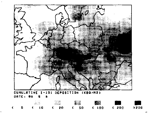 Koncentrationen af I-131 (målt i kBq/m2) akkumuleret efter Tjernobyl ulykken 26. april til 6. maj 1986. Computermodel baseret på måledata. Kilde: WHO.