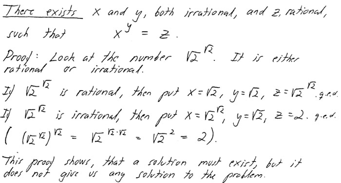 Antag at er et rationelt tal, dvs. at kan skrives som en brøk med hel positiv tæller og nævner, eller at = p / q hvor p og q er hele positive tal. Vi kan også antage at p / q er en uforkortelig brøk (skulle den ikke være det kan vi blot forkorte indtil den bliver uforkortelig).